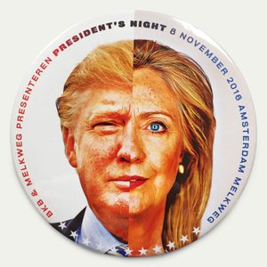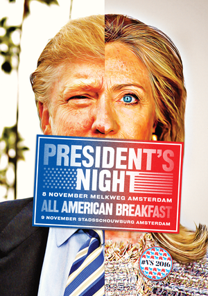 Every four years the (link: http://www.bkb.nl text: BKB) campaign agency and the Melkweg(link: www.melkweg.nl) organize the President's Night, the night before the American elections. With the first edition in 2008 we created the split campaign image of Obama and McCain. In 2016 we rejoined the organization and used the same principle combining the faces of Trump and Clinton. The 2016 edition started early in that year with pre-campaigns, polls, workshops and pre-events, all moving towards the big bang on the 8th of November.